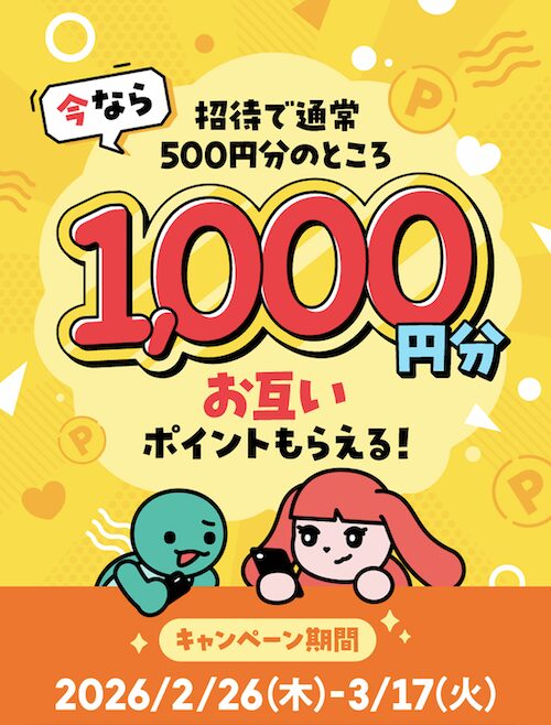 ポイぷる | 【入会完了で即1000P】最大5,000P友達紹介キャンペーン (3/31まで) 招待コード【sH4eRbcYln】 ポイントの貯め方はこちら! |