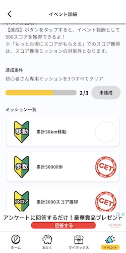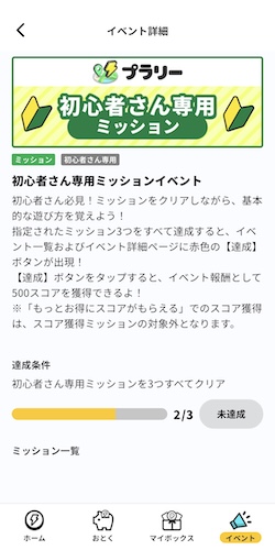 プラリーは初心者限定のミッションを達成すると500スコアを獲得できます。