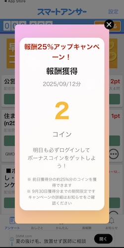 2025年9月30日獲得分までの期間限定で、前日獲得分の約25%分のコインを獲得できます。