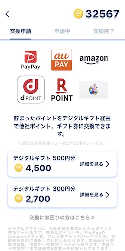 貯まったポイントはデジタルギフトを経由してPayPayマネーライトやアマギフ、dポイントなどと交換できます。