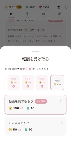 歩数は1万歩が上限ですが、動画を見ることで歩数上限を増やすこともできます。