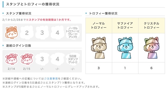 グレードアップすると獲得したトロフィーに応じた報酬がもらえます。(例:2個目のサファイアトロフィー獲得時には2,000ptではなく、クリスタルトロフィーの5,000ptが自動的に付与されます。)