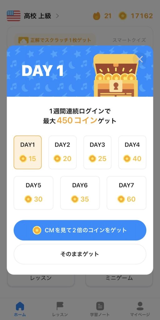 連続で動画を視聴しなかったり、8日目のポイントを受け取った場合は1日目に戻ります。更新時間は24:00です。