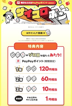 ガチャはサイトに訪問し、Yahoo! JAPAN IDでログインをして「サイコロを振る」ボタンを押すと抽選に参加できます。サイコロの出た目によってPayPayポイントが当選します。