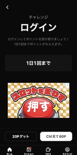 ただし、ポイントを受け取るにはボタンをタップする必要があります。また、ボタンをタップしてログインボーナスを受け取る際のアプリの動作が重たいので、その辺りは改善されると良いですね。