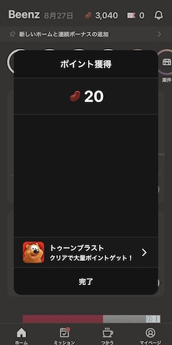 ビーンズはログインでポイントが貯まります。連続でログインすることでボーナスポイントを受け取ることも可能です。