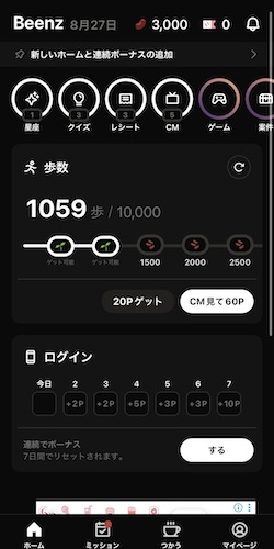 ビーンズでおすすめのコンテンツは歩数とログインです。