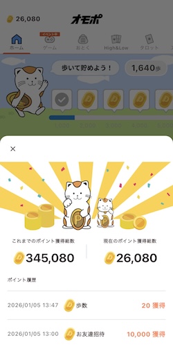 オモポは1日10,000歩まで、歩数でポイントが貯まります。