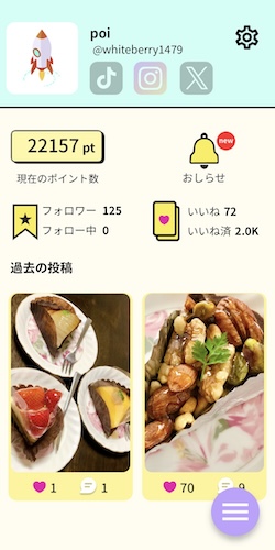 また、自分が他ユーザーの投稿にいいねしたり、友達に招待コードを利用してもらうことでもポイントを獲得可能です。