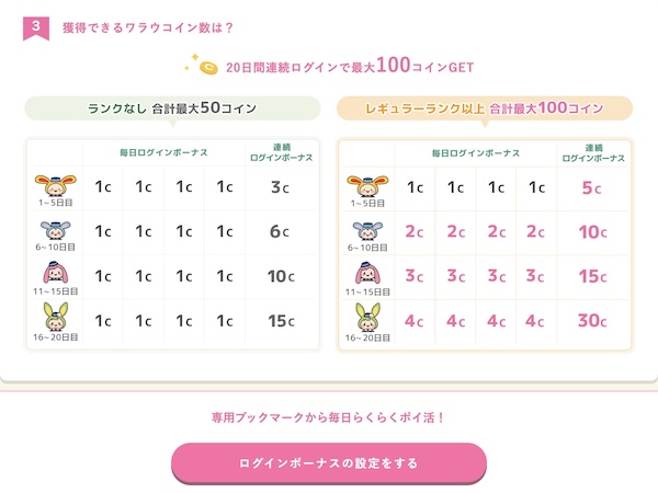 ワラウでログインのポイントを受け取るにはこちらのページから「ログインボーナスの設定をする」からブックマークする必要があります。